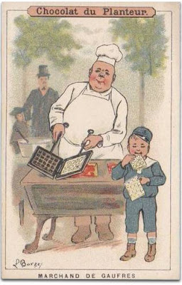 La série Chocolat Lombard met en parallèle les mêmes métiers et leurs cris à deux époques différents : 1740 et 1910.
